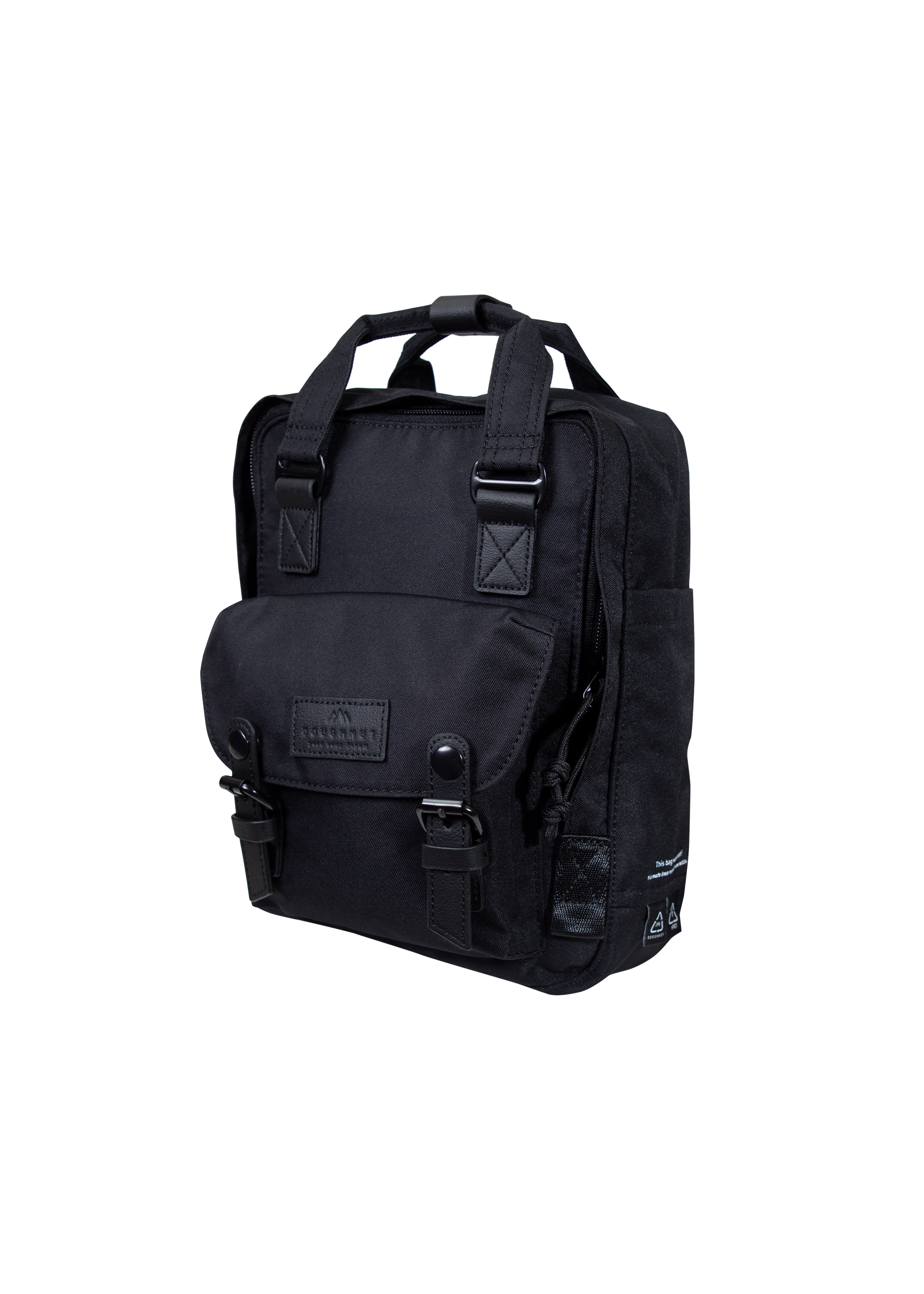 Overconsumption has led exploitation of natural resources reaching or nearing a peak. To change the game by moving away from selling backpacks made from precious virgin raw materials, our designers reformed Doughnut’s classic bags with a complete adoption of recycled ones. Different details of our products go green, including the lining, fabric and leather trimmings. We incorporated REPREVE®️ Polyester, a sustainable textile made from recycled plastic bottles. The bottles are chopped, melted, extruded and then spun into polyester yarn. Similarly, the leather is composed of shredded leather. Our vision is to create products using minimum of resources and to achieve zero-waste production in the future. From now, stylish Reborn bags carry more than your belongings but unique stories of the recycled materials. The classic Macaroon Mini has a roomy and highly functional interior with multiple compartments, organizing your daily essentials in style.